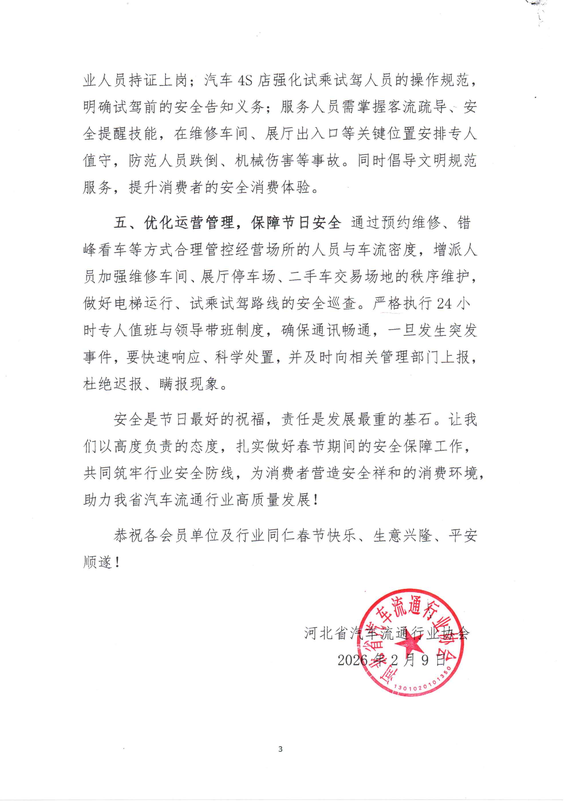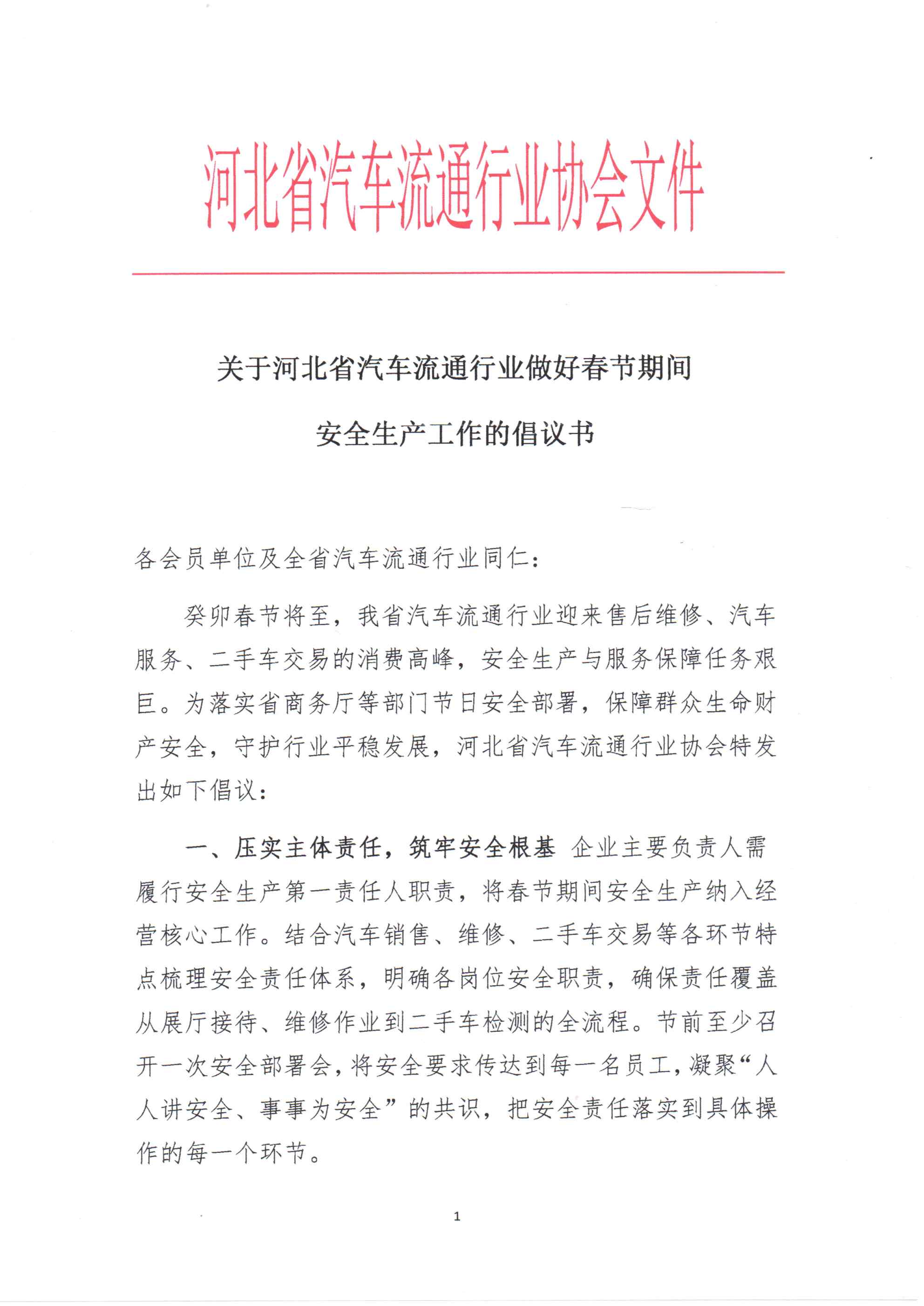 关于河北省汽车流通行业做好春节期间 安全生产工作的倡议书