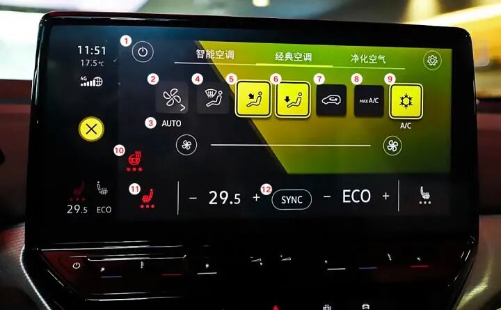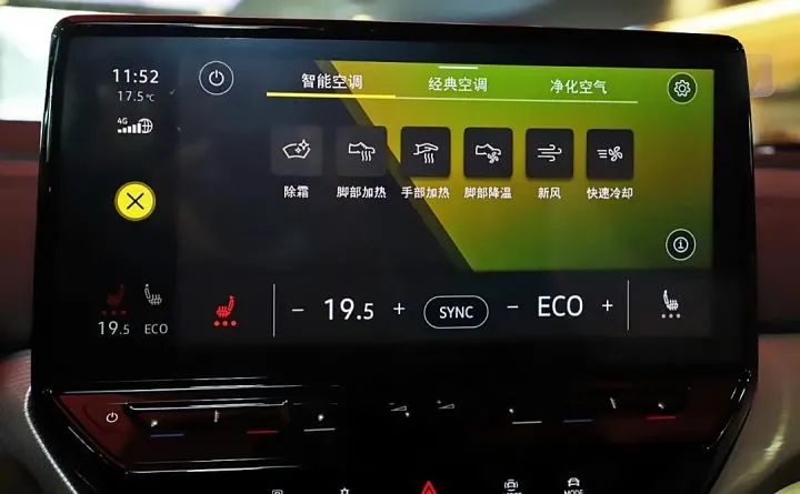 打开空调之后,在信息娱乐系统屏幕上会出现三种模式分别是智能空调、经典空调和净化空气,首先通过一个图来看一下智能空调: