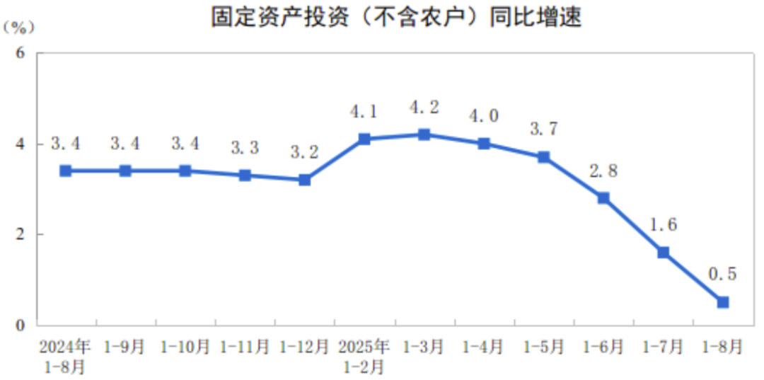 2025年1—8月份,全国固定资产投资(不含农户)326111亿元,同比增长0.5%(按可比口径计算)。其中,民间固定资产投资同比下降2.3%。从环比看,8月份固定资产投资(不含农户)下降0.20%。
