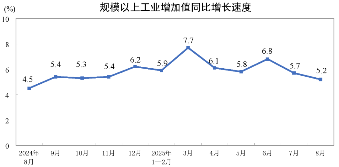 8月份,规模以上工业增加值同比实际增长5.2%(增加值增速均为扣除价格因素的实际增长率)。从环比看,8月份,规模以上工业增加值比上月增长0.37%。1—8月份,规模以上工业增加值同比增长6.2%。