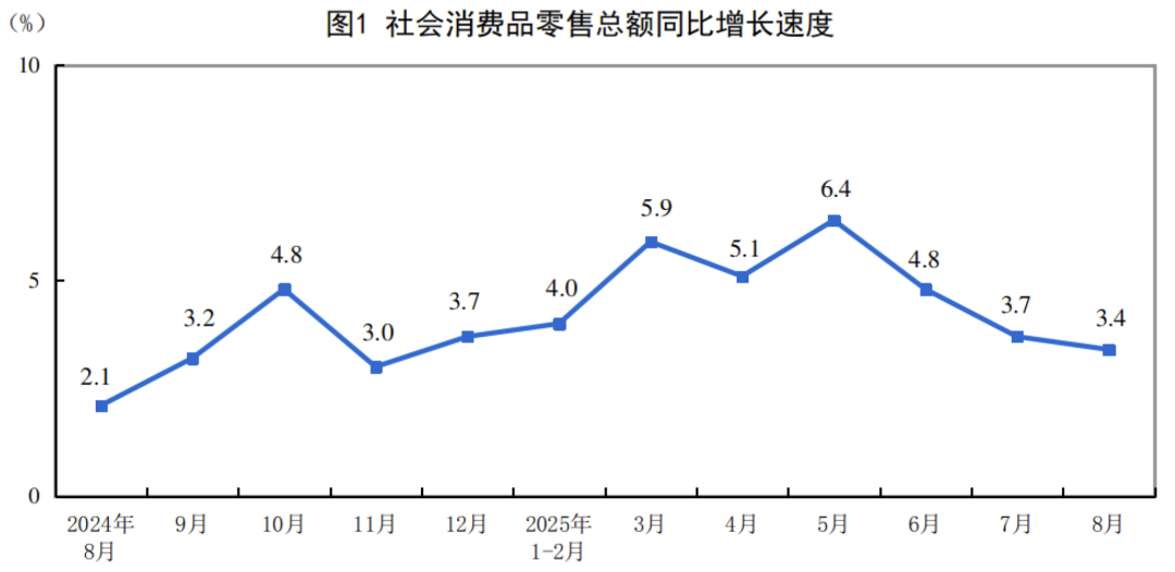 8月份,社会消费品零售总额39668亿元,同比增长3.4%。其中,除汽车以外的消费品零售额35575亿元,增长3.7%。1—8月份,社会消费品零售总额323906亿元,增长4.6%。其中,除汽车以外的消费品零售额292643亿元,增长5.1%。