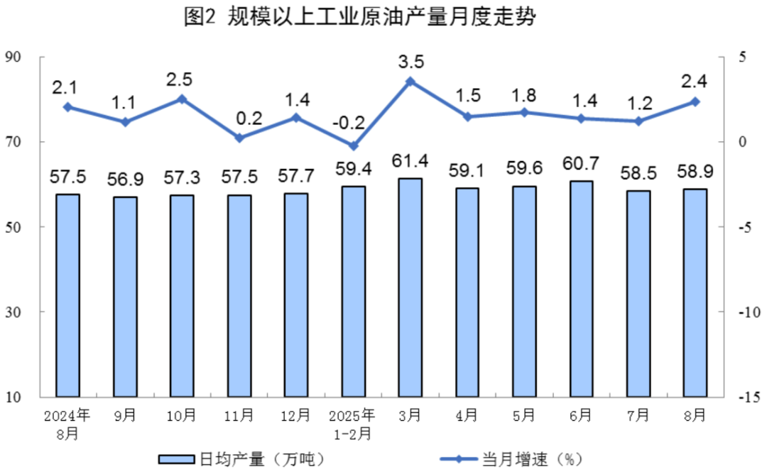 原油生产增速加快。8月份,规上工业原油产量1826万吨,同比增长2.4%,增速比7月份加快1.2个百分点;日均产量58.9万吨。