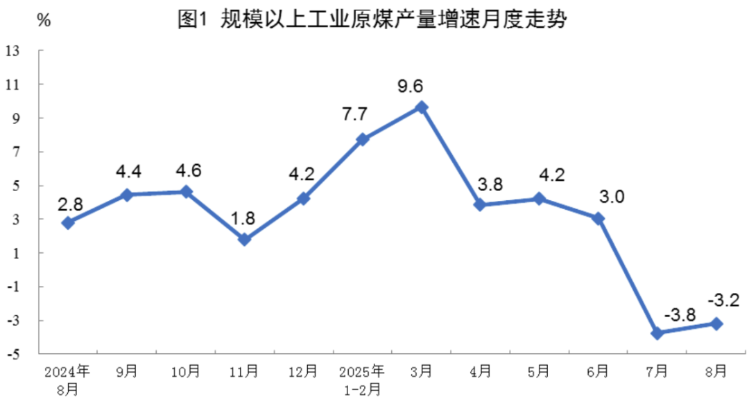 原煤生产降幅收窄。8月份,规上工业原煤产量3.9亿吨,同比下降3.2%,降幅比7月份收窄0.6个百分点;日均产量1260万吨。