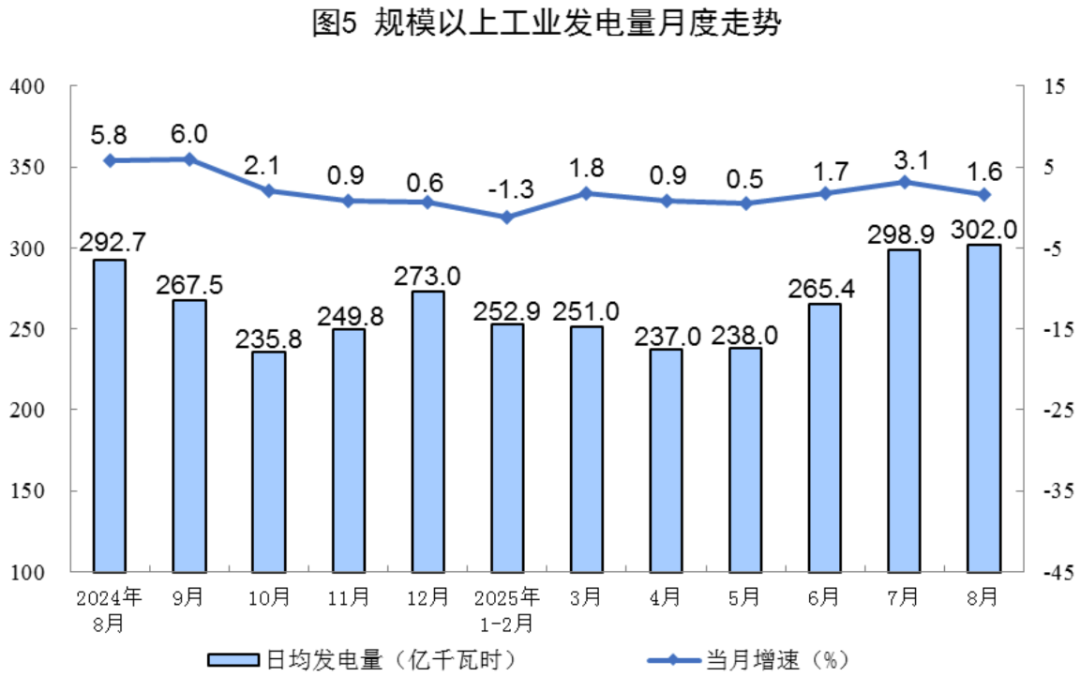 规上工业电力生产平稳增长。8月份,规上工业发电量9363亿千瓦时,同比增长1.6%;日均发电首次突破300亿千瓦时,达302.0亿千瓦时。1—8月份,规上工业发电量64193亿千瓦时,同比增长1.5%,扣除天数原因,日均发电量同比增长1.9%。