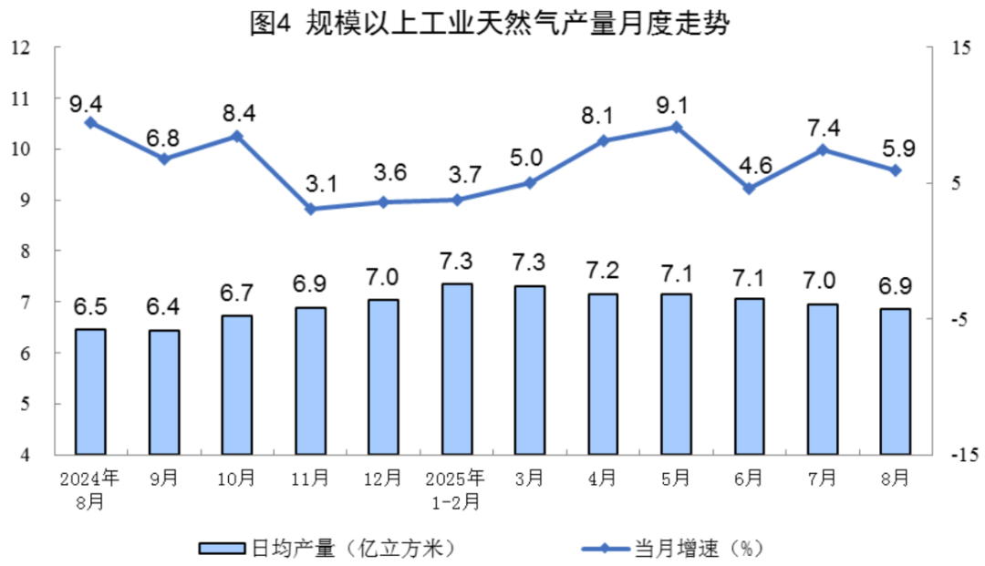天然气生产稳定增长。8月份,规上工业天然气产量212亿立方米,同比增长5.9%;日均产量6.9亿立方米。