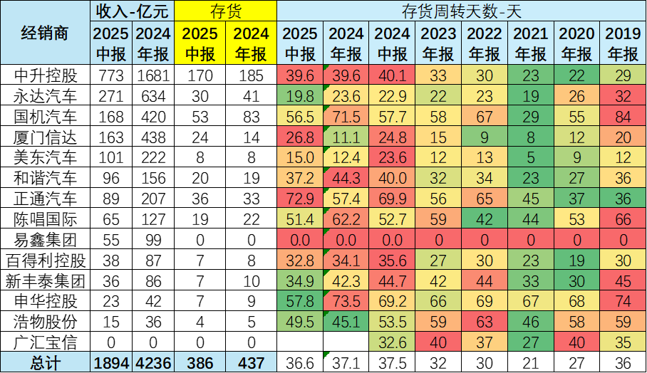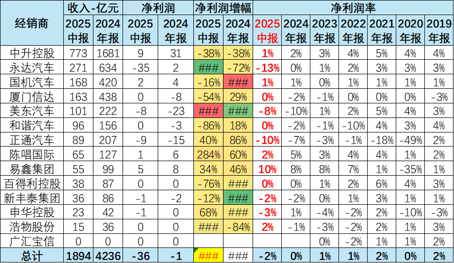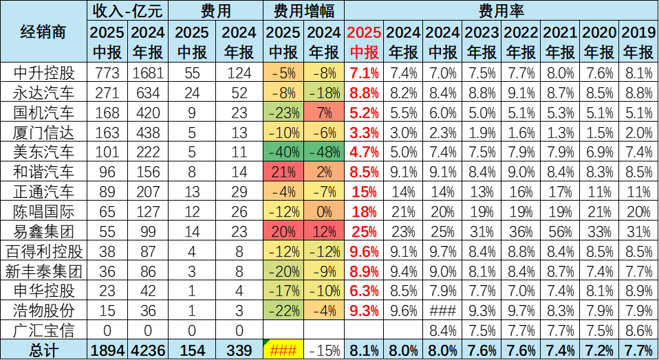2025年中国汽车经销商总体营业收入处于下滑之中,部分可统计的经销商2025年上半年下降10%,主流市场低迷,燃油车购车市场需求低迷的压力巨大。2025年像和谐、申花等都出现了营业收入环比2024年较大增长的良好表现。头部大型家商包括中升汽车集团等都出现了相对较稳的走势。