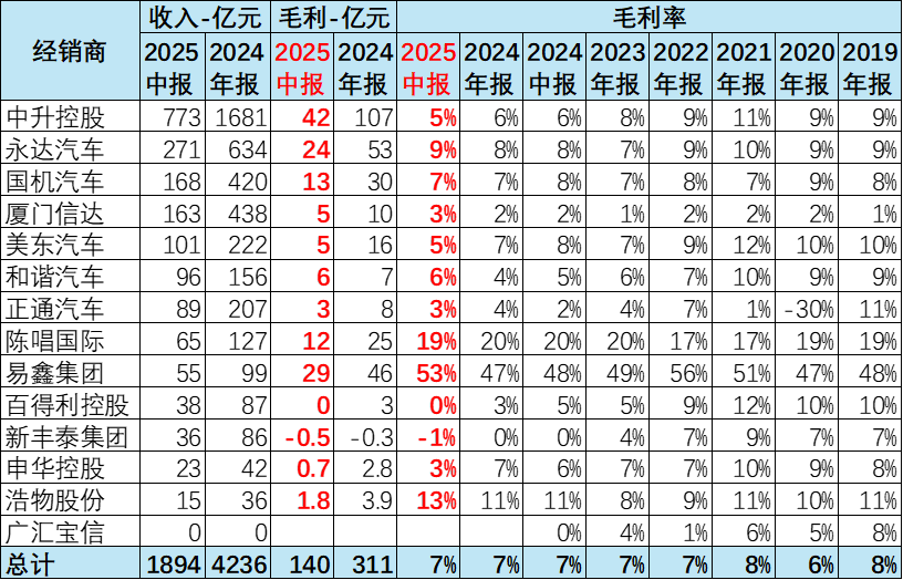 中国经销商集团2025年的毛利平均为7%左右水平,较2024年的7%基本持平,相对2019年的8%也出现了下降1个点。
