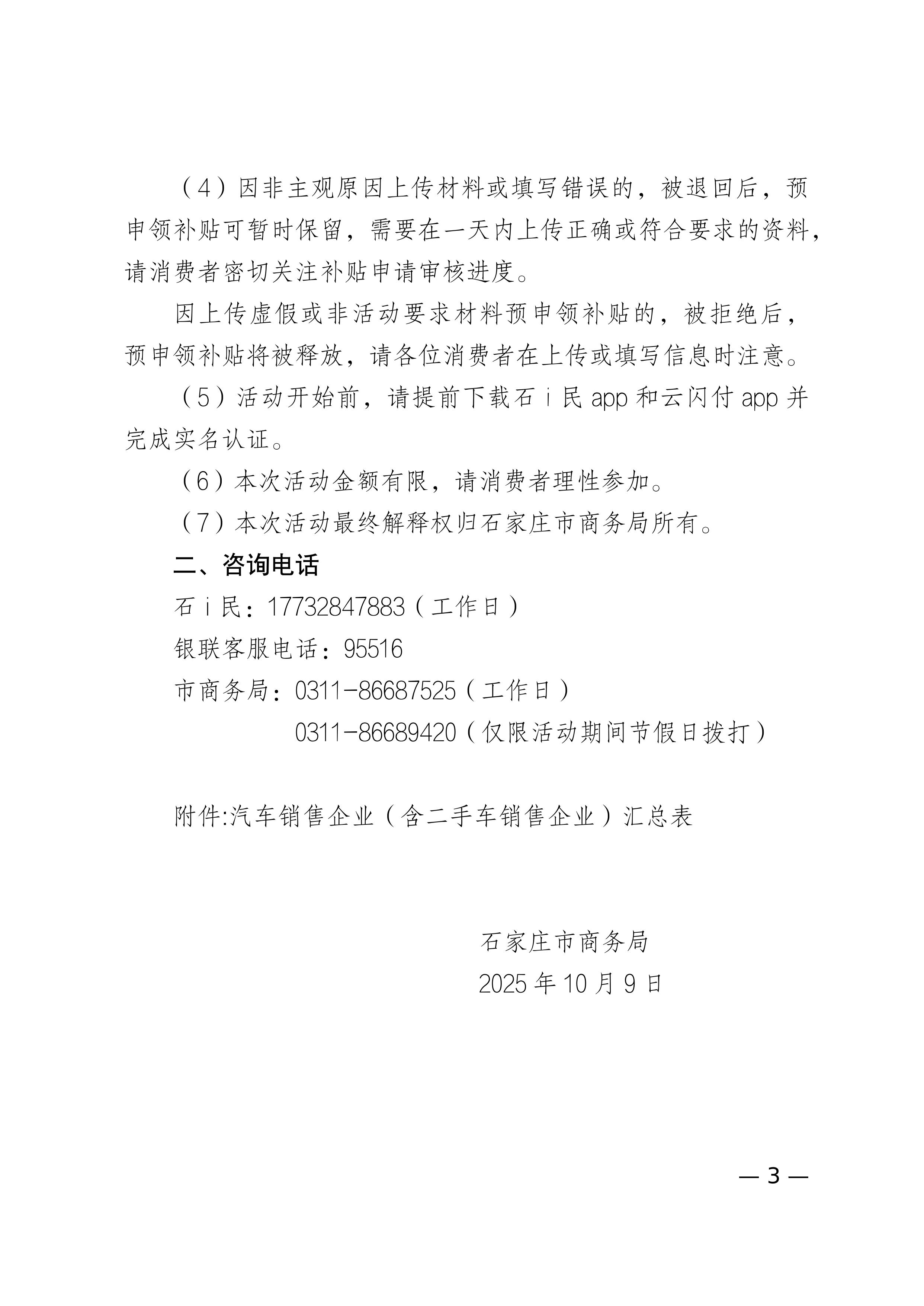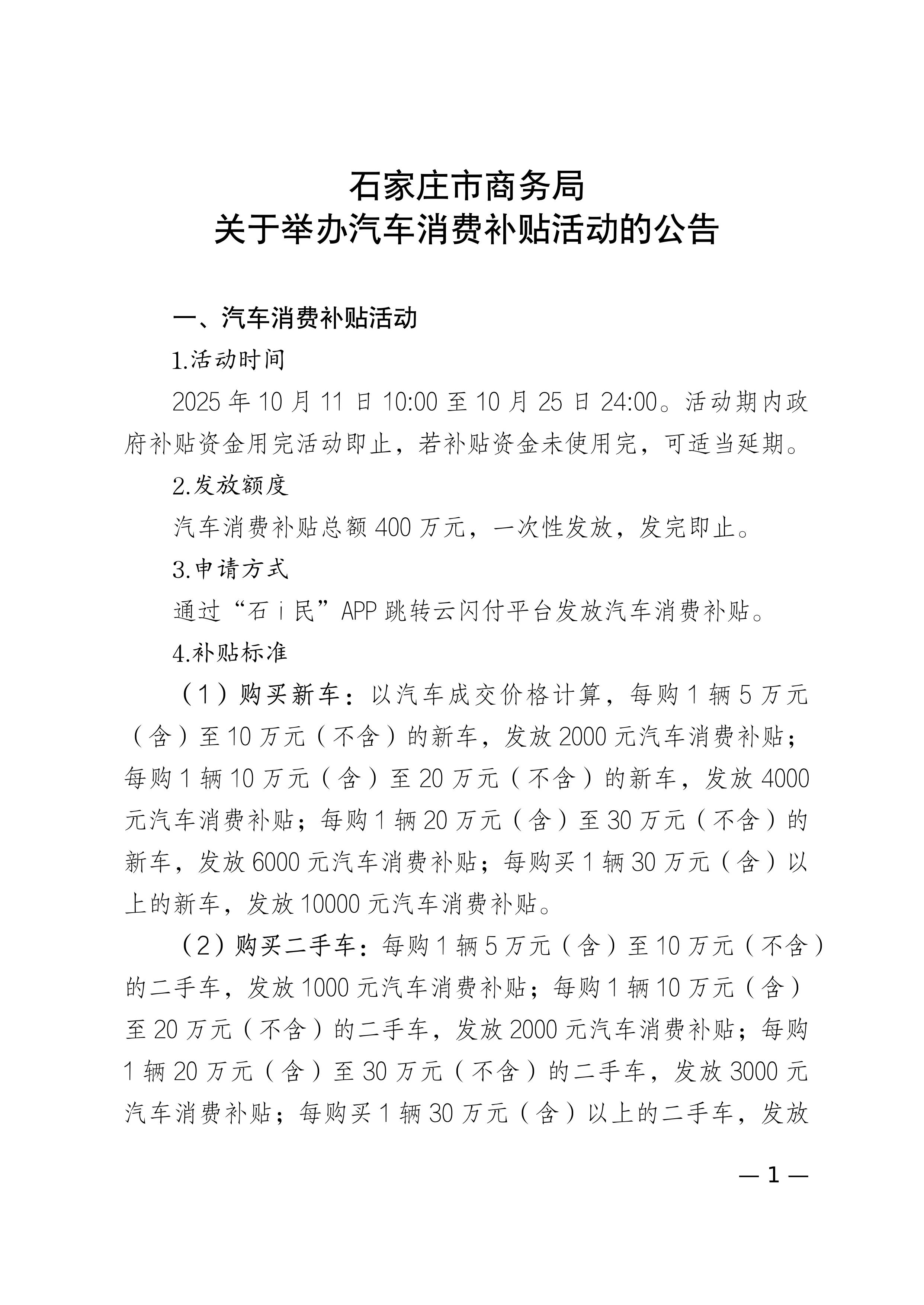 石家庄市商务局关于举办汽车消费补贴活动的公告