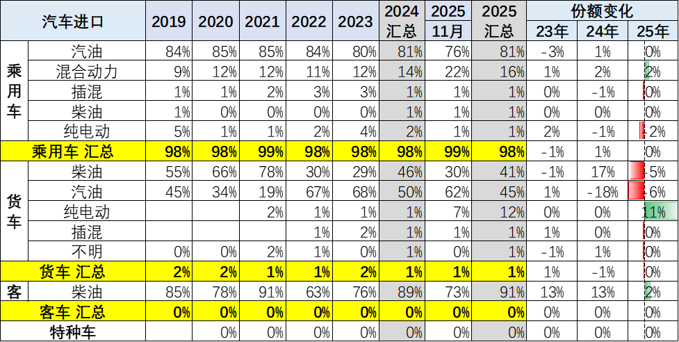 2024年进口乘用车新能源进口占比达到3%,2025年1-11月进口新能源车占比下降到2%,纯电动较去年有小幅下降,燃油乘用车仍是绝对主力。货车中的汽油车比例仍是较高的,但柴油车提升较好。