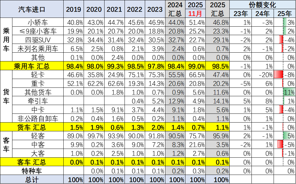2019年以来各类进口车型全面下滑。传统的卡车2023年进口较多,目前快速回落明显。2025年1-11月乘用车的进口小于需求,持续去库存。