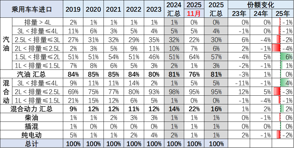 乘用车的进口车型排量原本集中于2升以下汽油车型,2025年1-11月占比整个汽油车的进口量60%的比例,较去年增加7个点。