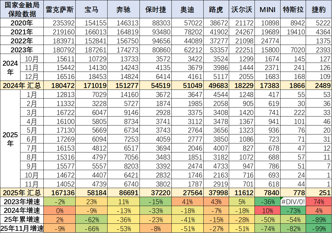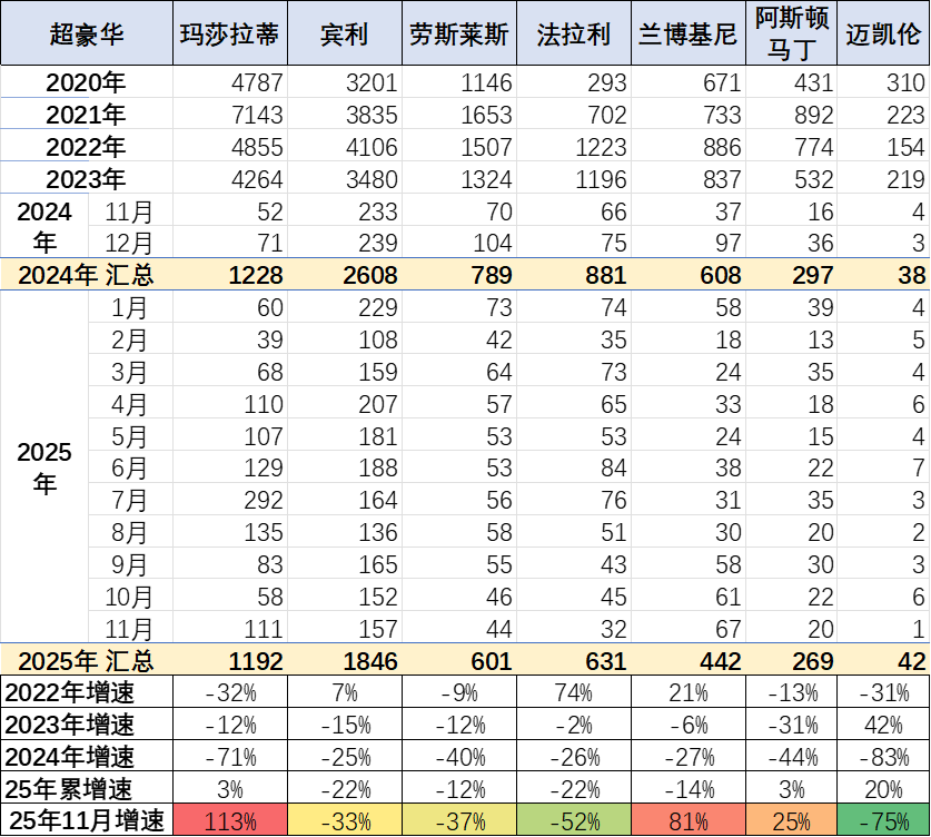 过去几年进口超豪华车持续增长,但2023年以来出现较大的下滑,2024年加速下滑,2025年1-11月下滑仍较严峻。玛莎拉蒂的走势总体异常较高。劳斯莱斯表现较坚挺。法拉利的走势低迷。超豪华总体走弱,体现超高端消费群体的购买力暂时放缓,近期抛售带来的超豪华车销量异常,市场价格合理回归。