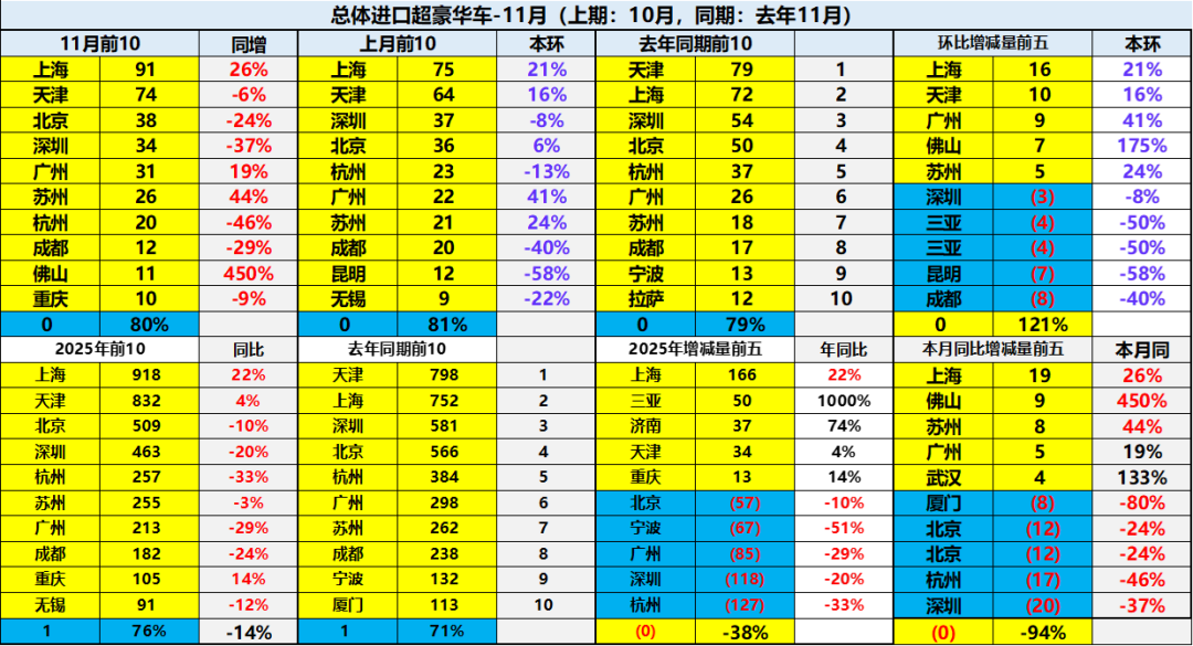 进口车市场的需求总体偏弱,上半年天津超越上海保持超豪华第一,近期上海回升较好,因股市暴增等,上海的进口超豪华车近期环比上升较大。