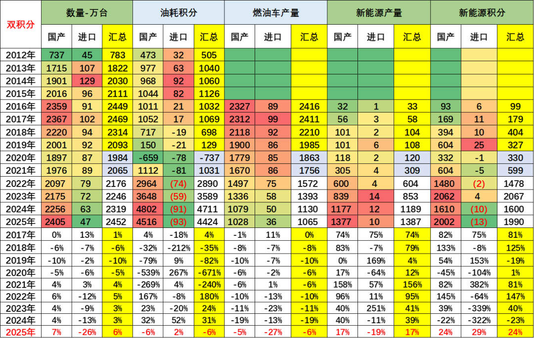 2025年,根据双积分政策统计的国内乘用车产量达到2452万台,其中国产车产量2405万台,进口车47万台,国产车同比增长在7%,进口车竞争力下降,总体乘用车国内供给量达到2452万台增长6%。