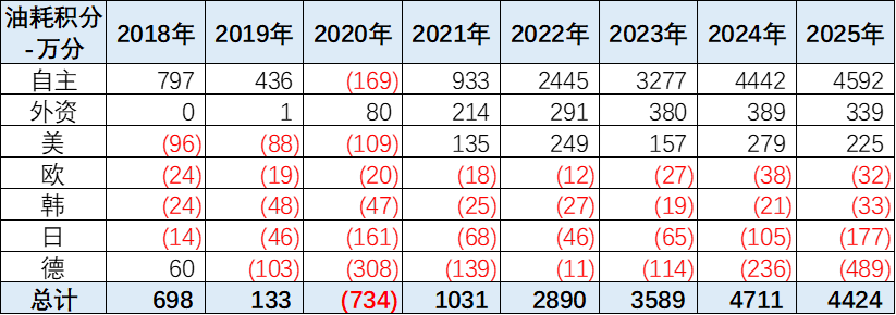 2025年平均油耗达到负积分的企业相对变化不大。前期油耗压力大,现在是油耗积分不用太考虑,比油耗压力更大的是生存问题。