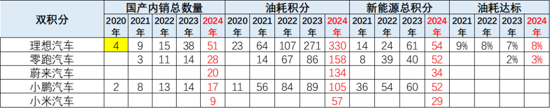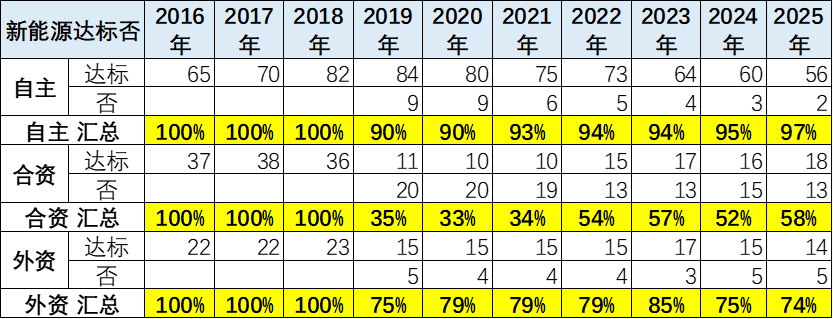 自主车企的新能源积分在不断改善,合资新能源达标率近三年明显提升,持续突破50%。进口车的新能源达标率实现较好。