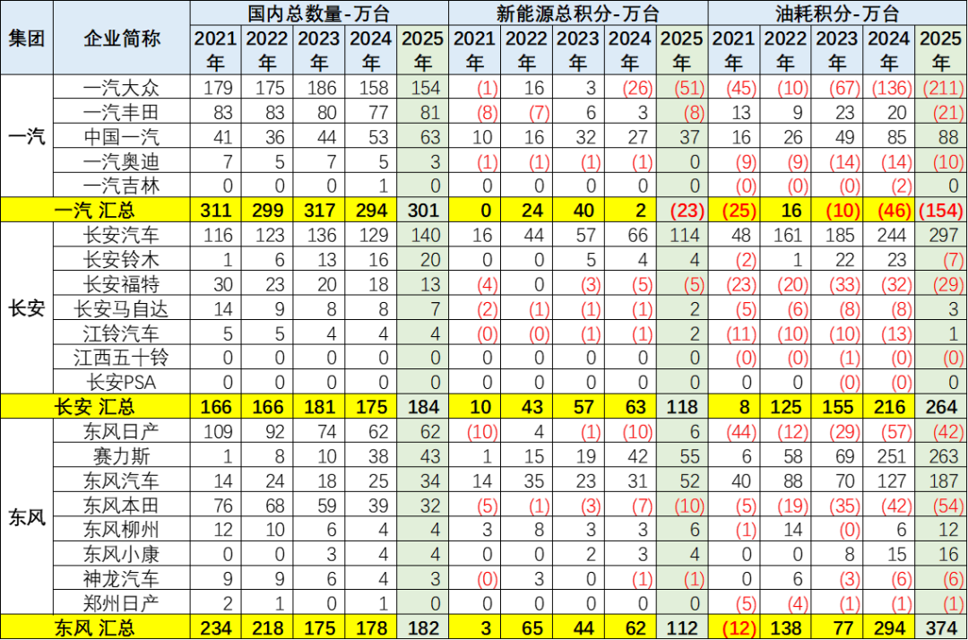 一汽、长安、东风的三大央企车企集团的总体表现较好,其中一汽丰田等很多合资车企都是新能源和油耗正积分积累。一汽大众、长安福特、东风日产等企业的新能源需要进一步提升。